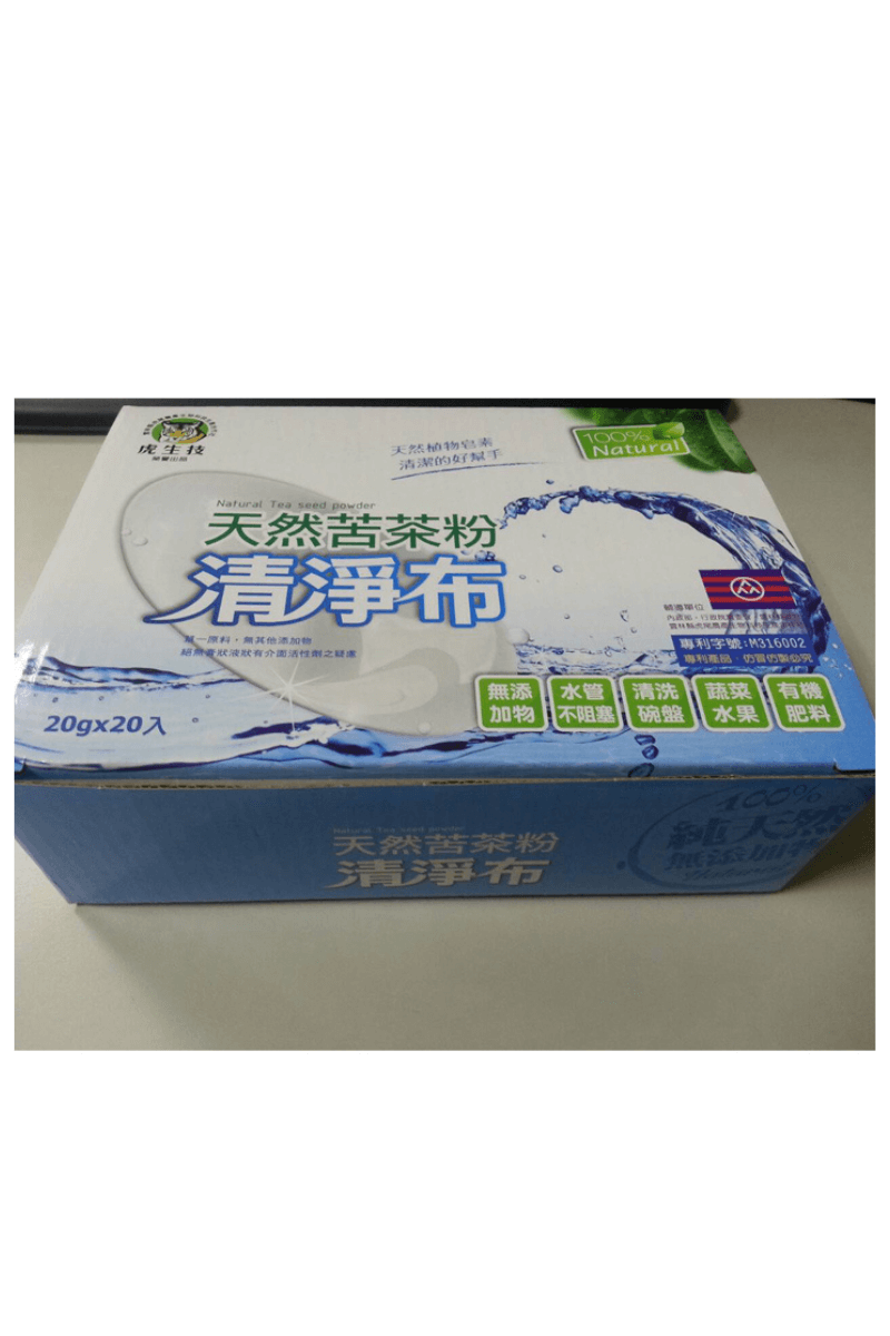商品名稱:環保清淨布。 商品規格:20g*20入。 商品售價:$250。 成份:苦茶粉 保存期限:3年。 內容物:15g。 使用方法: 1.清淨布沾溼當菜瓜布清洗碗盤,可以多次使用。 2.一包清淨布泡約1公升的水。 *可清洗疏菜水果。 *可清洗碗盤。 *可當有機肥料。 3.使用完清淨布可直接當垃報丟棄,避免彎管的水管阻塞。 清淨布包裝設計專利字號:M316002